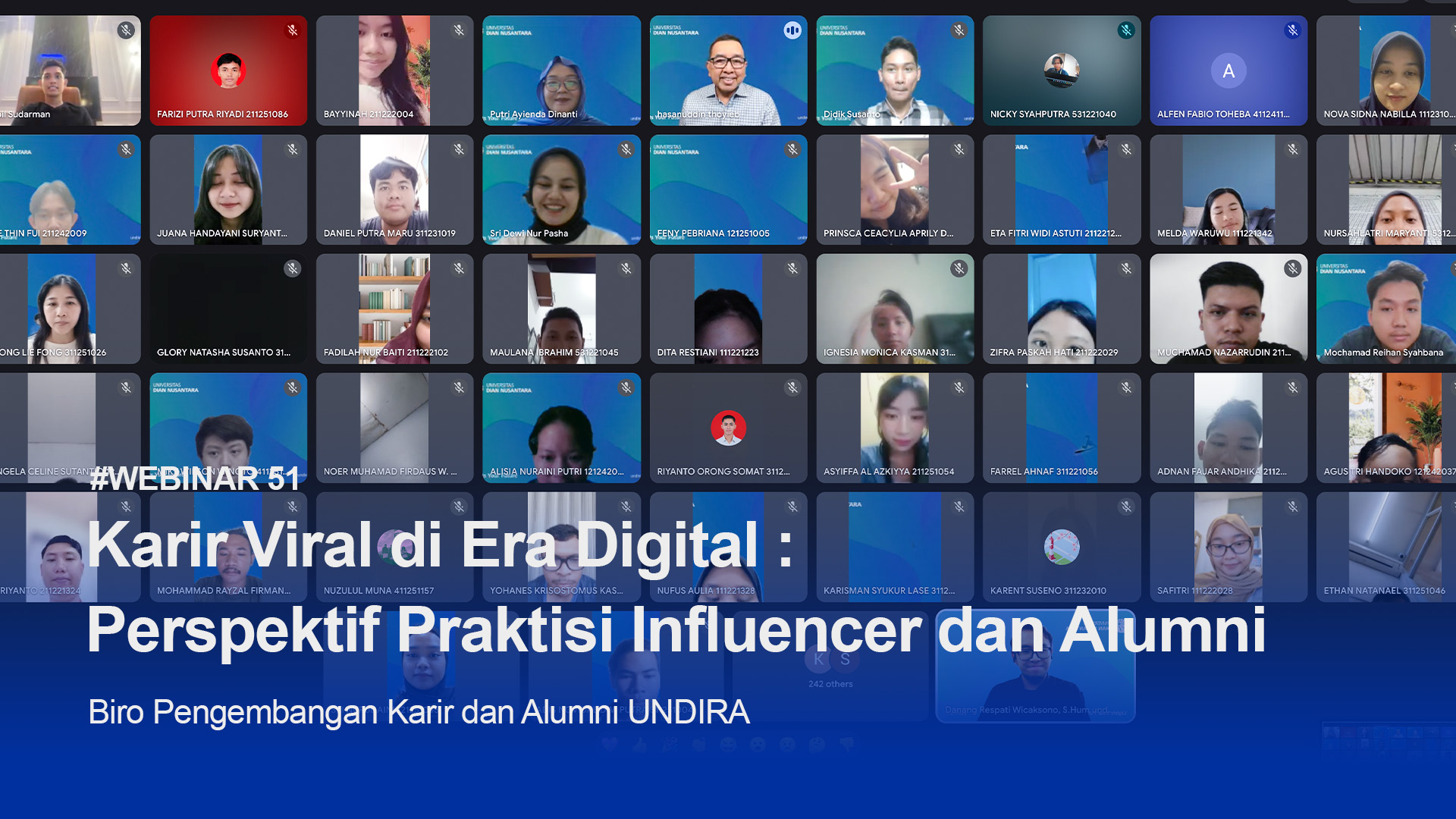 Memahami bahwa pembekalan karier di era digital adalah prioritas utama sebuah institusi pendidikan, Biro Pengembangan Karier dan Alumni Universitas Dian Nusantara (BPKA UNDIRA) turut serta mengadakan sesi WEBINAR interaktif terbuka bertajuk “Karier Viral DI Era Digital: Perspektif Praktisi Influencer dan Alumni“ pada tanggal 14 Januari 2026 lalu.
