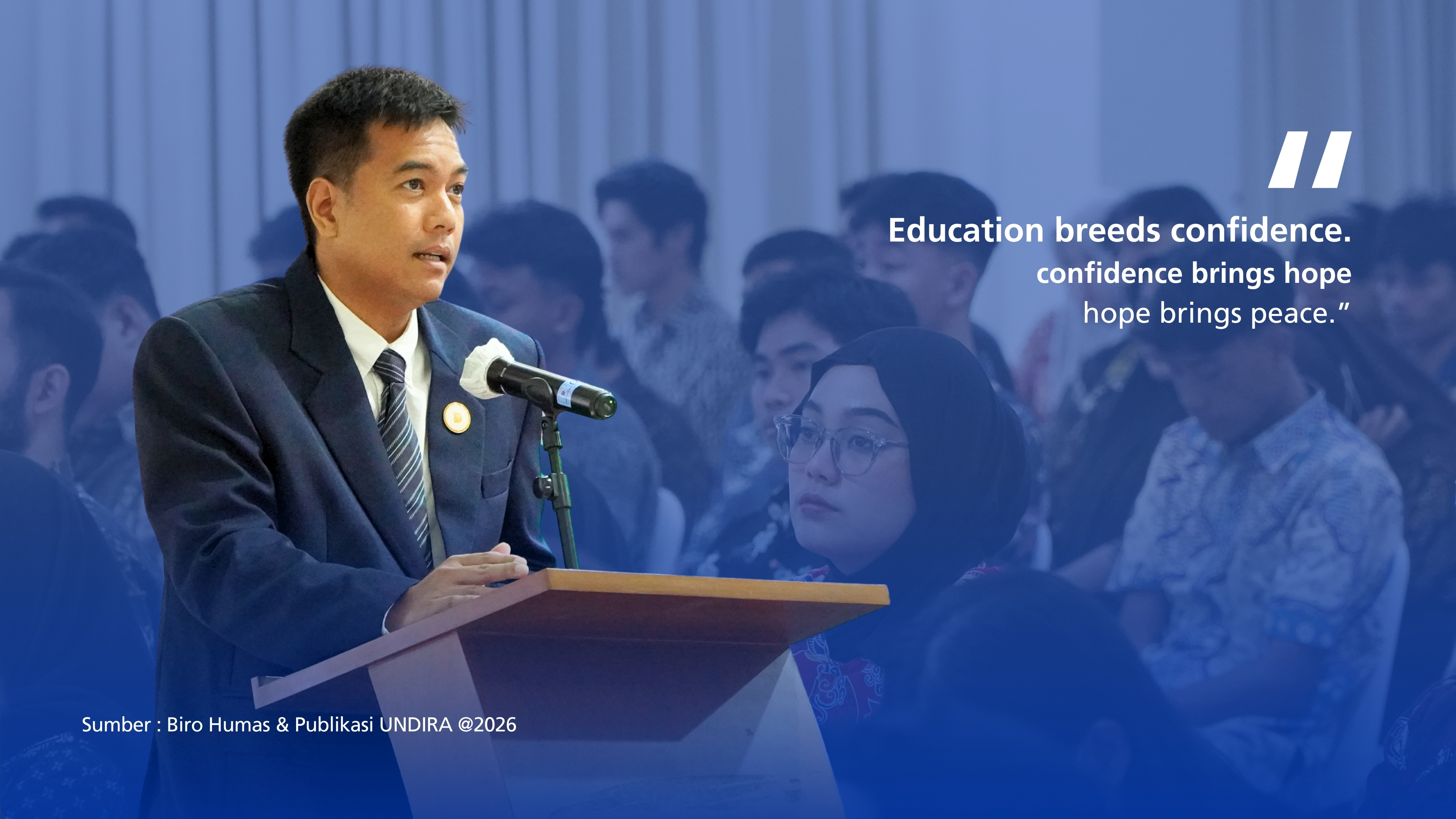 “Teman-teman sekalian, melihat situasi saat ini, saya teringat kembali dengan salah satu filosofi yang dikemukakan Confucius yang berbunyi ‘education breeds confidence, confidence brings hope and hope brings peace’. Saat ini dunia tidak lagi berpihak secara absolut kepada kekuatan semata, melainkan kepada mereka yang memiliki keingintahuan untuk berinovasi, keberanian untuk memimpin dan mencoba, dan juga adaptif nan bijaksana dalam perubahan yang menghampiri hidupnya.” lanjut beliau